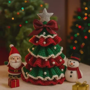 Create a magical holiday atmosphere with this beautifully designed Crochet Layered Christmas Tree Pattern. This pattern guides you step by step to crochet a charming 3D Christmas tree featuring elegant layered ruffles in classic festive colors, delicate pearl-style decorations, a lovely bow, and a sparkling star topper.