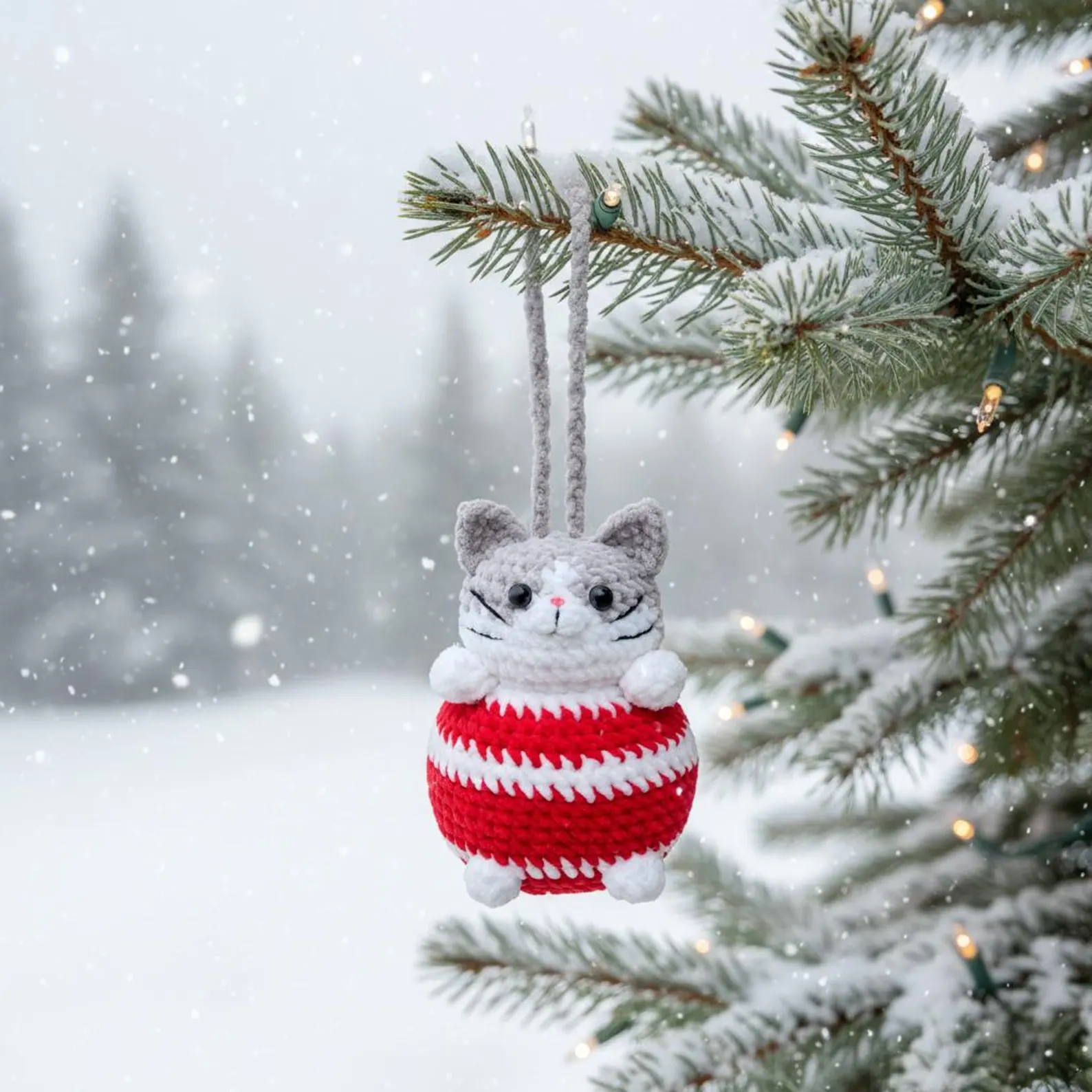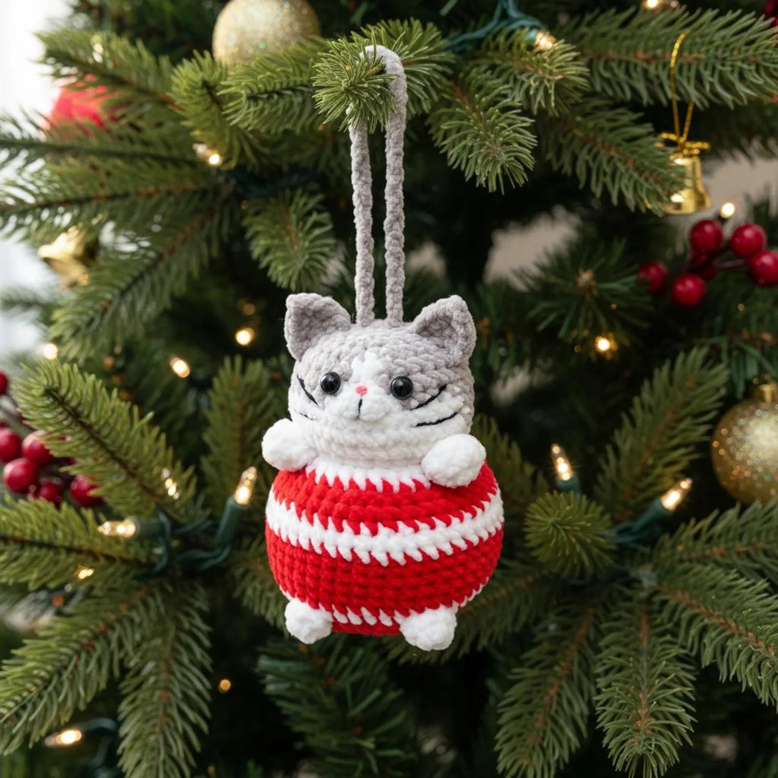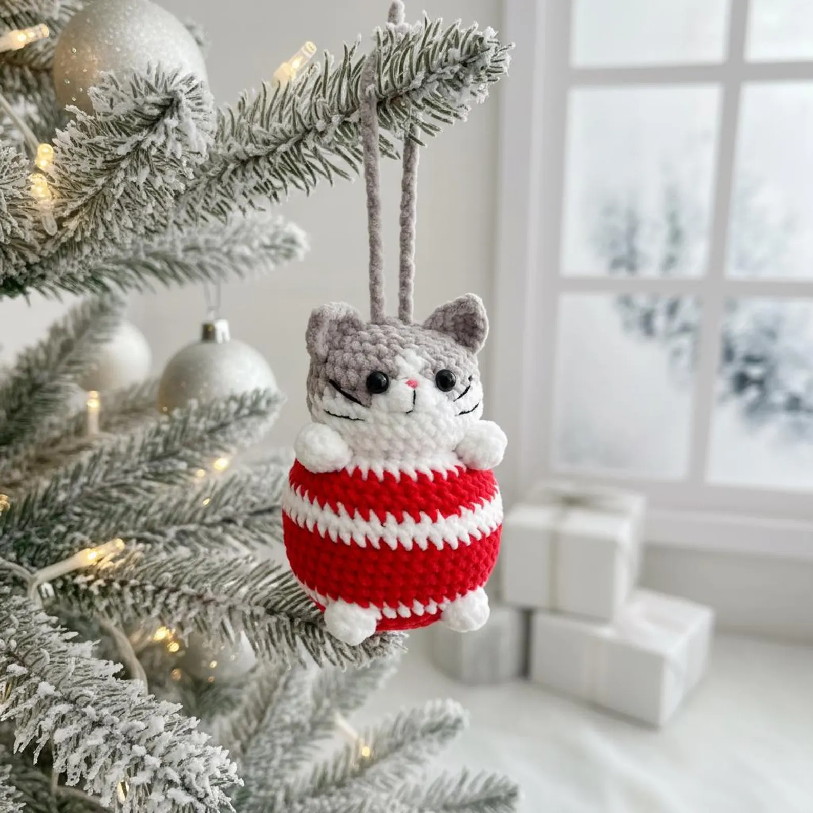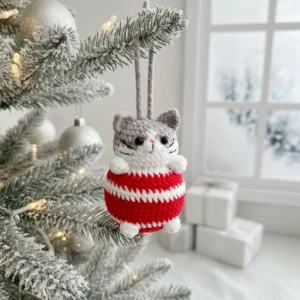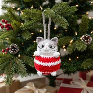 Create an irresistibly cute crochet cat ornament with this delightful amigurumi pattern! Designed as a cozy hanging decoration, this chubby little kitty features sweet paws, tiny whiskers, expressive eyes, and a festive striped sweater body. Perfect as a Christmas tree ornament, gift topper, nursery décor, or keepsake, this tiny companion adds charm wherever it’s displayed.