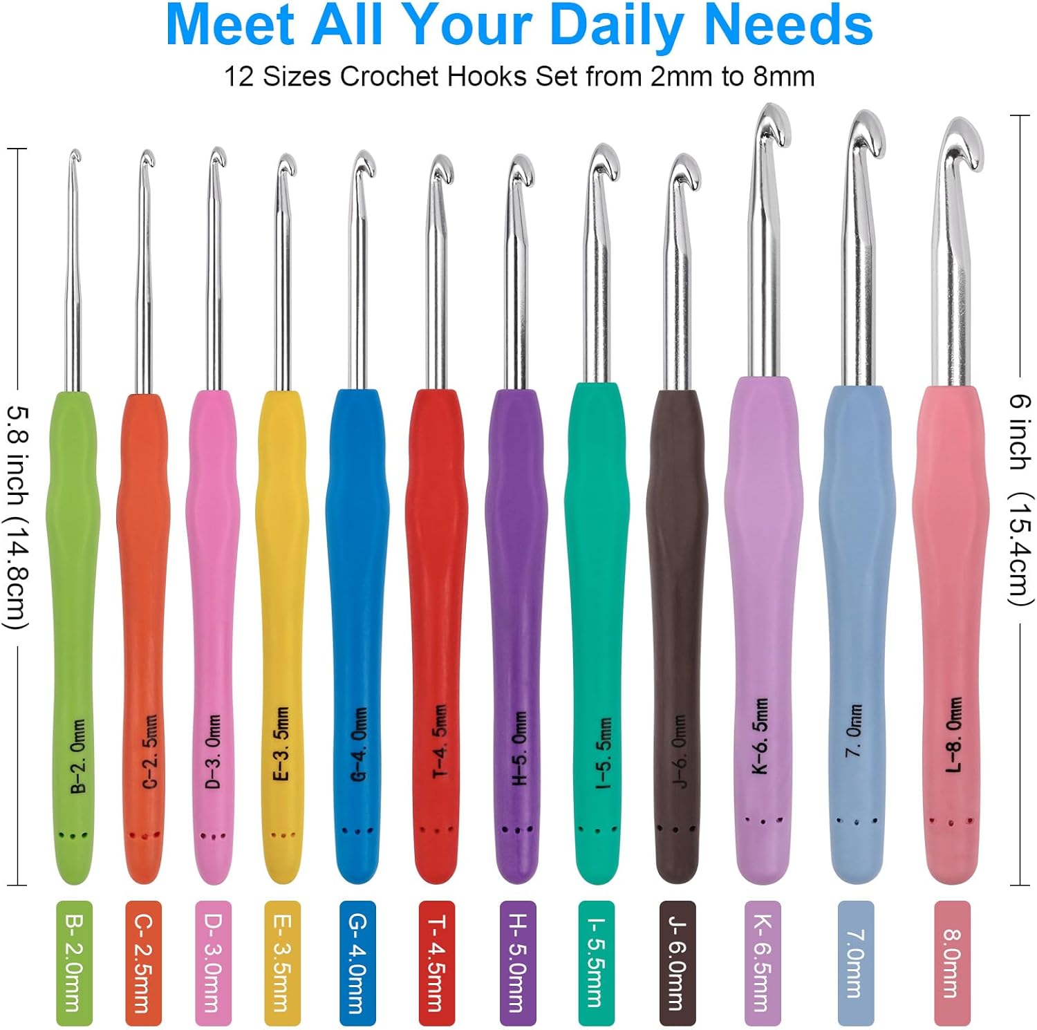 Each crochet hook is made of high-quality aluminum for long-lasting strength and smooth gliding. The ergonomic soft silicone handle provides comfort and stability, with the aluminum hook deeply embedded to prevent loosening — sturdier and longer-lasting than plastic crochet hooks.